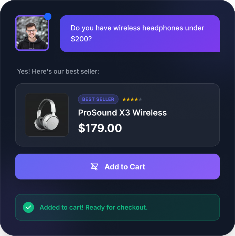 Why send customers away when they're ready to buy? Chatzio shows product cards and lets visitors add items to cart — all without leaving the conversation.
